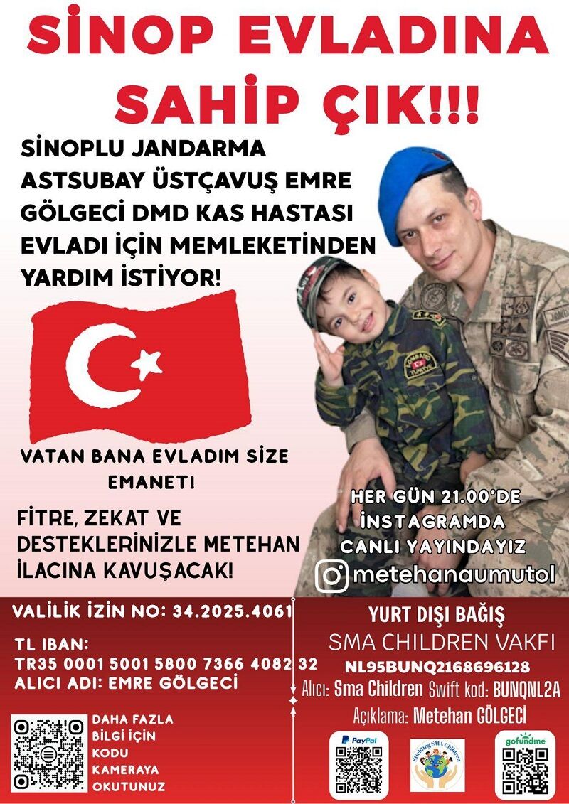 Sinoplu Jandarma Astsubay Üstçavuş Emre Gölgeci’nin 3 yaşındaki oğlu Metehan Gölgeci, doğumundan kısa bir süre sonra Duchenne Musküler Distrofi (DMD) teşhisi aldı. DMD, kas kaybına yol açan ve genellikle çocukluk döneminde ortaya çıkan ciddi bir kas hastalığıdır. Uzun süredir bu hastalıkla mücadele eden aile, İstanbul Valiliği onayıyla başlatılan yardım kampanyasının tamamlanabilmesi için vatandaşların desteğini bekliyor.